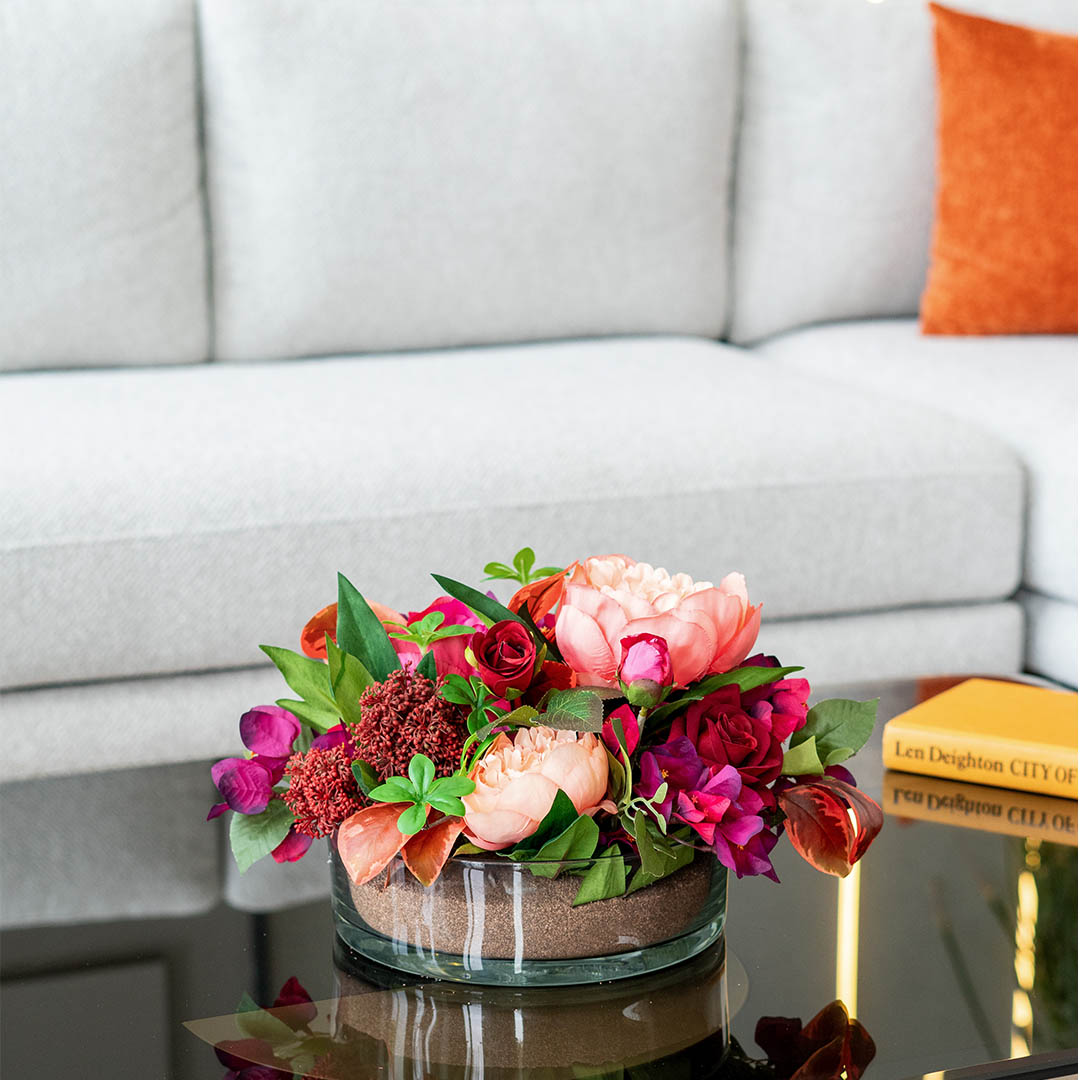 Coralia , un mélange raffiné de pivoines, bougainvilliers et roses rouges pour sublimer votre décoration intérieure.