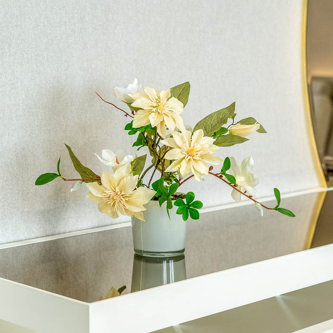 Apportez élégance et simplicité avec Ivoria, clematis crème, parfaite pour vos centres de table, étagères ou bahuts.