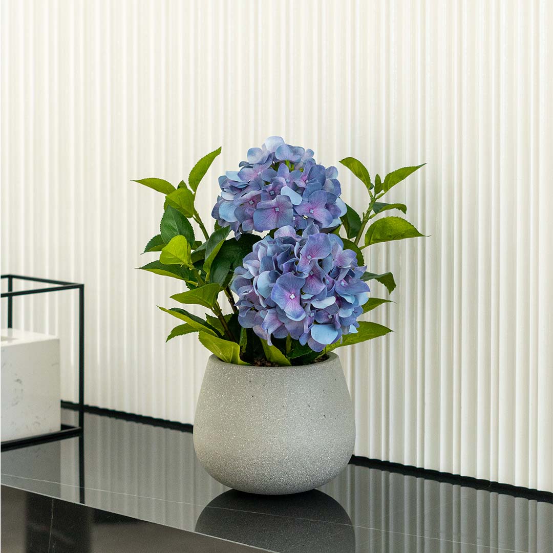 Apportez fraîcheur et caractère avec Marinea, hydrangeas bleus dans un rond en pierre Sandy Gris, parfaite pour vos centres de table et étagères.