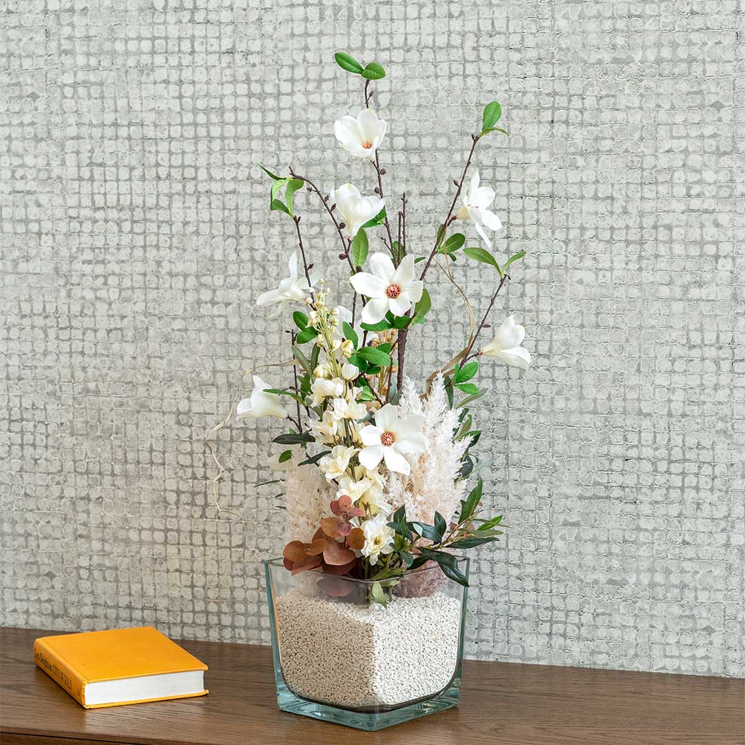 Son magnolia blanc majestueux, d’une hauteur de 70 cm, se marie harmonieusement avec les plumes de pampas délicates, créant un jeu de textures élégant et contemporain.