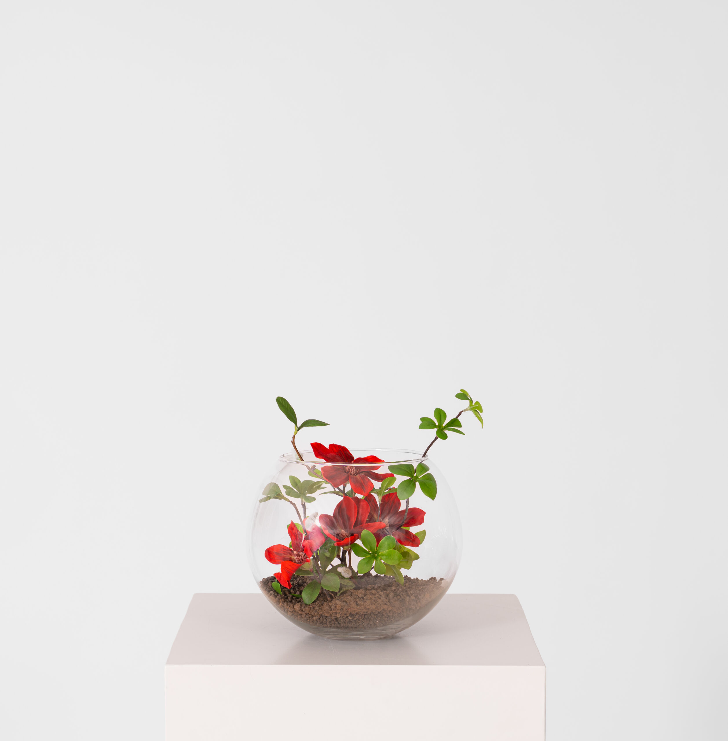 Magnolia rouge dans un vase boule transparent, Bijou est un petit trésor romantique et délicat.