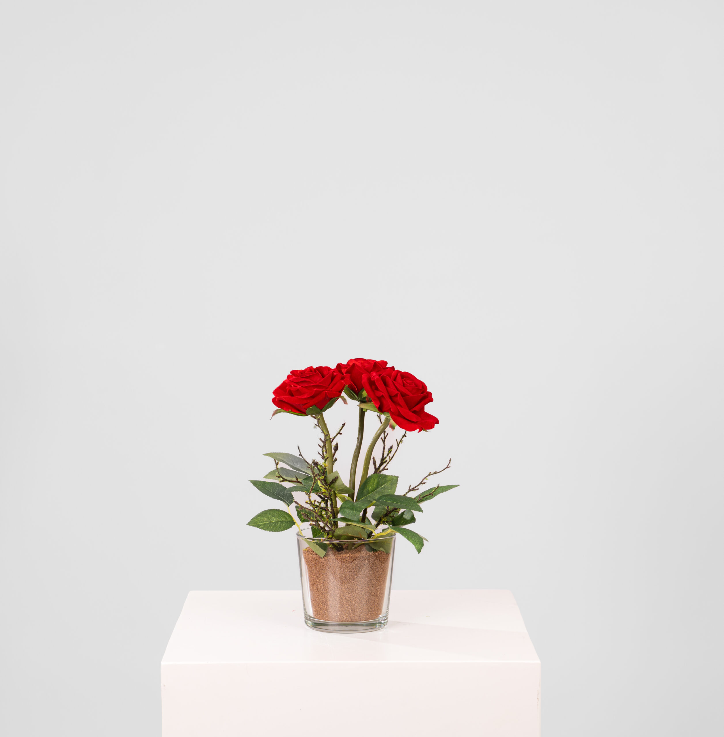 3 roses rouges veloutées dans un vase rond transparent, Roxie incarne charme et séduction.