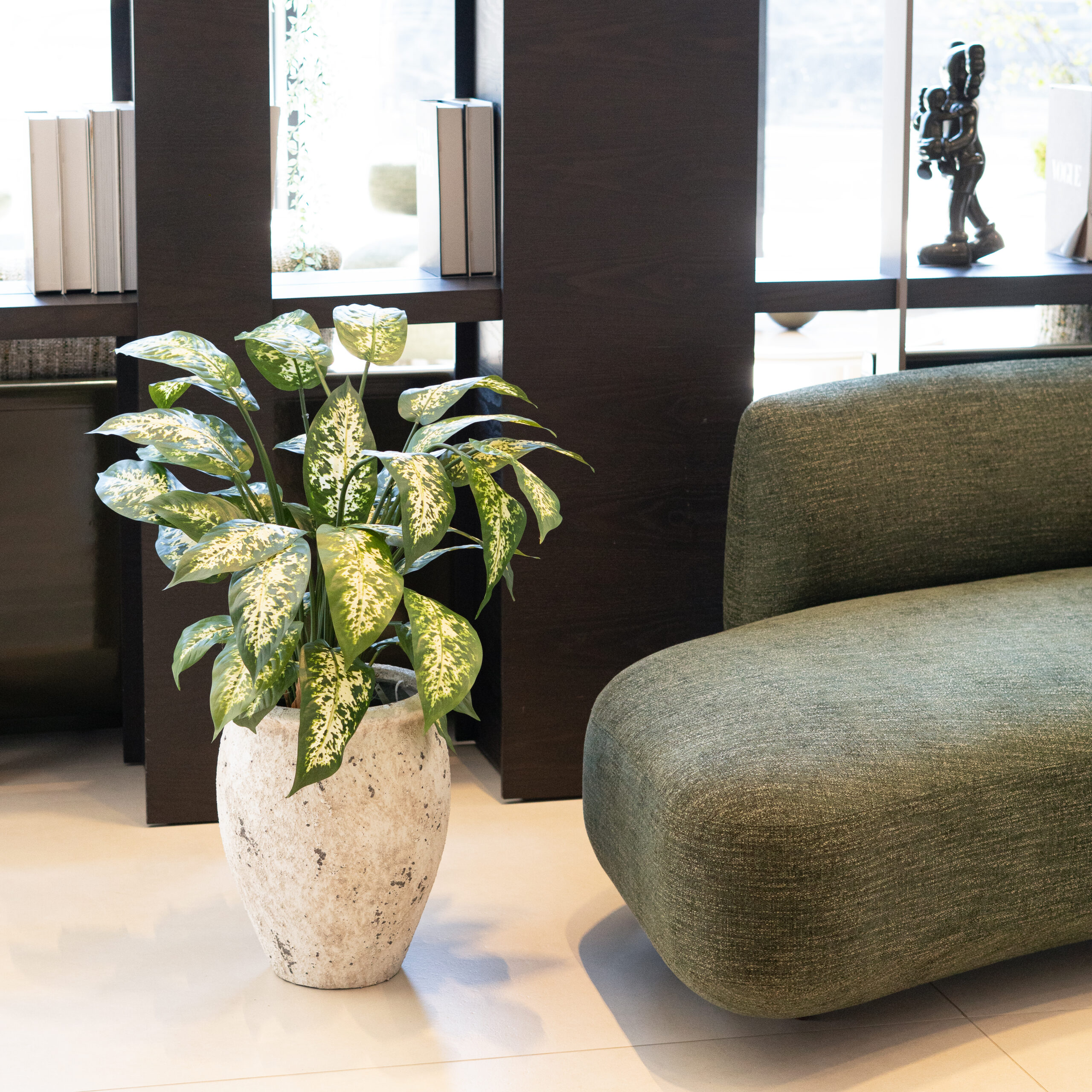 Idéale pour être placée sur une console, un meuble ou au sol dans un espace lumineux, cette Dieffenbachia se distingue par sa présence subtile mais impactante, qui structure l’espace et attire le regard sans encombrer la pièce.
